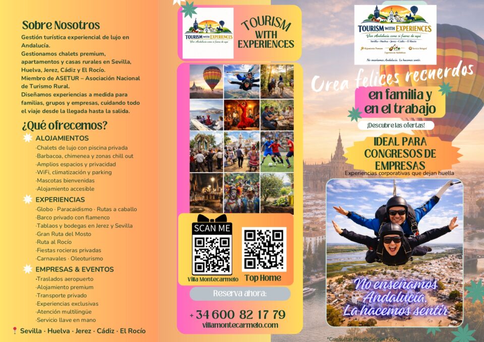 Además ofrecemos experiencias como: montar en globo, paseos a caballo, rutas con chofer, excursiones al Rocío, visitas guiadas por Sevilla, opciones de combo, Seviila – Jerez, paseos fluviales por el Guadalquivir y muchas más.